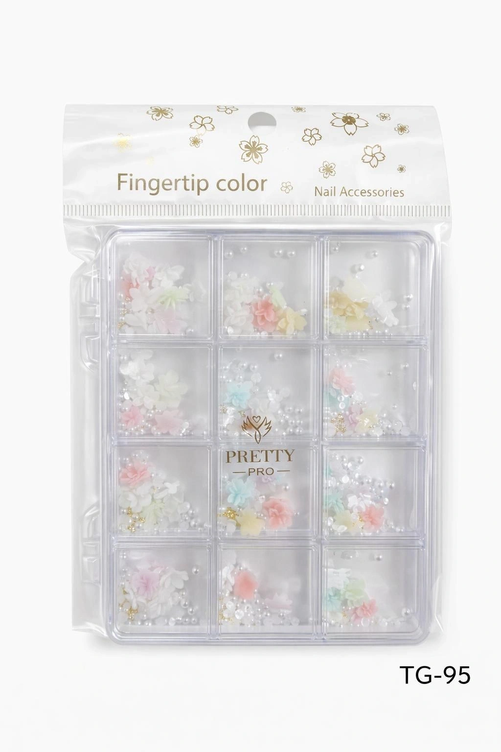 Zarif ve minimal nail art tasarımları için özel olarak hazırlanmış bu 12 bölmeli çiçek tırnak charm seti, inci ve çiçek figürlerinin uyumuyla estetik bir görünüm sunar. Soft tonlara sahip süsleme parçaları sayesinde doğal ve şık tırnak tasarımları oluşturabilirsiniz.