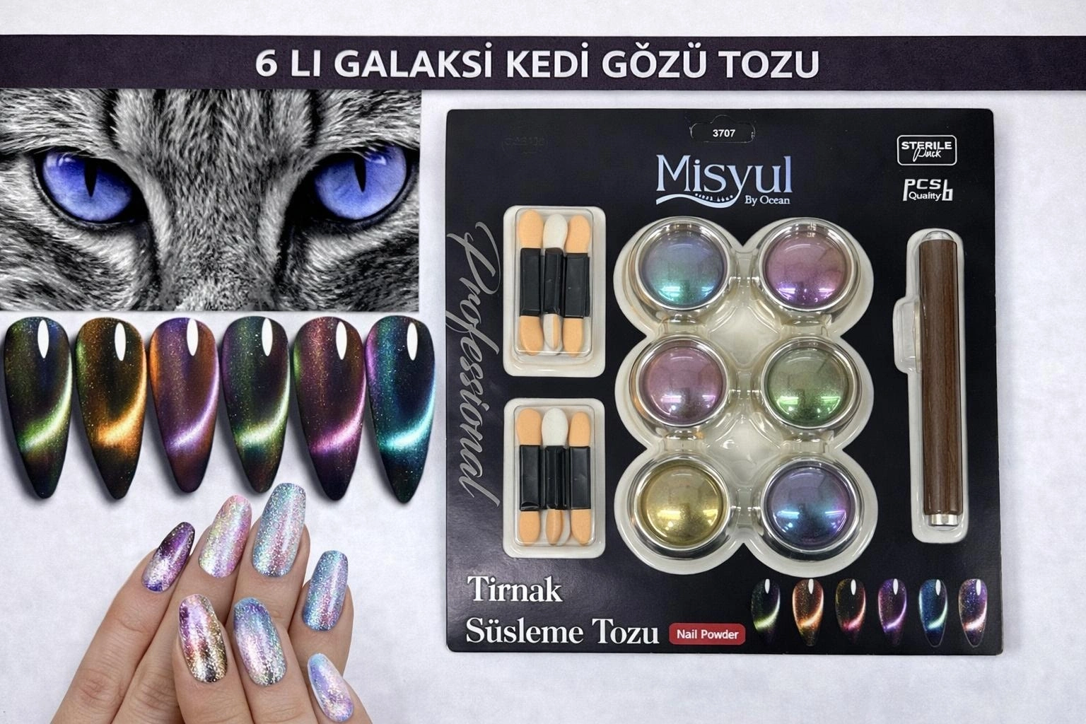 6’lı galaksi kedi gözü tırnak süsleme tozu seti, tırnak yüzeyinde yoğun ışık yansıması ve hareketli efektler oluşturarak dikkat çekici ve profesyonel nail art uygulamaları sağlar. Manyetik etkileşime duyarlı özel pigment yapısı sayesinde ışık çizgileri ve galaksi geçişleri kolayca oluşturulabilir.