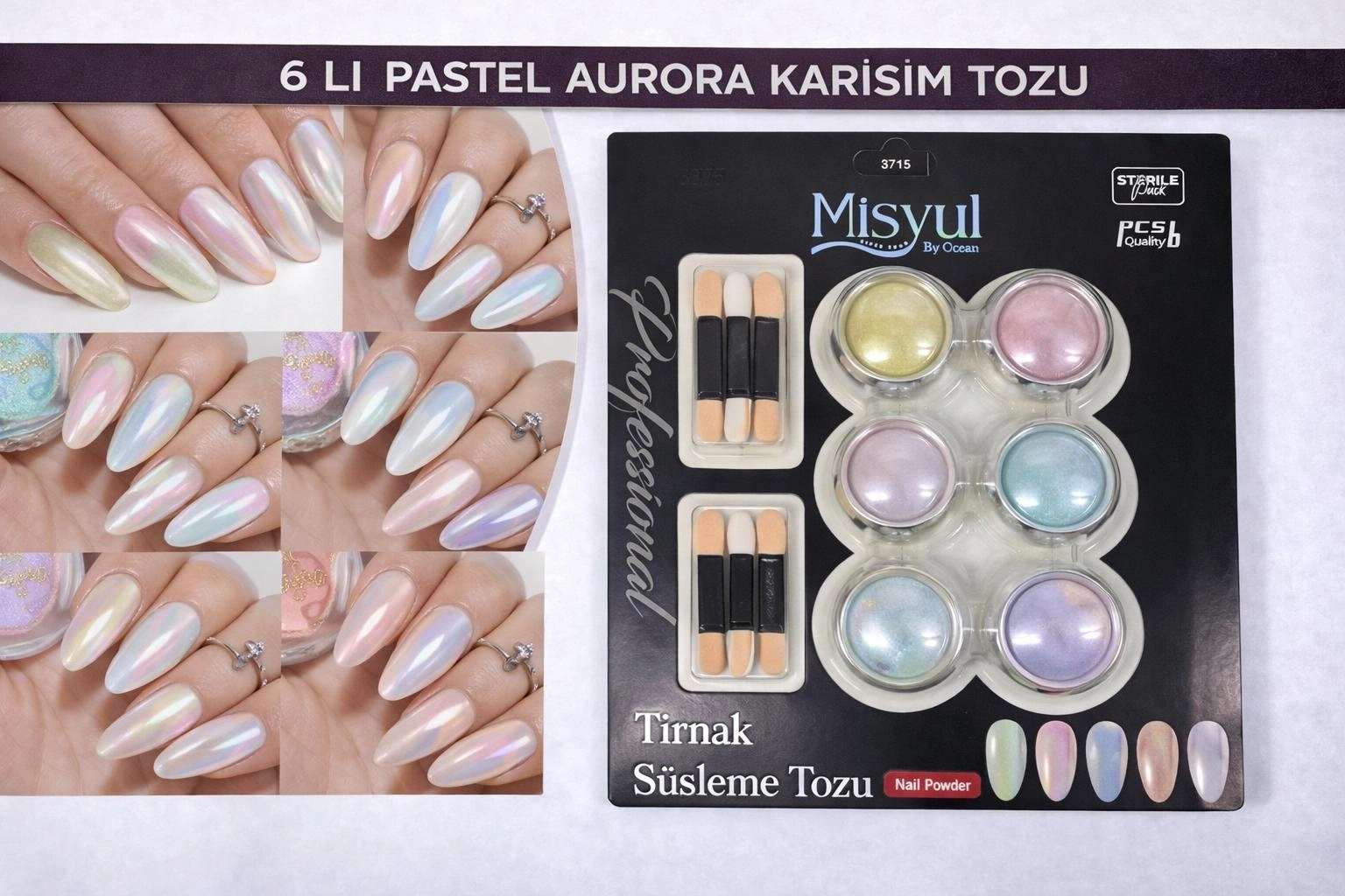 6’lı pastel aurora karışım tırnak süsleme tozu seti, tırnak yüzeyinde ışığa göre değişen yumuşak pastel tonlar ve zarif yansımalar oluşturarak doğal ve modern nail art tasarımları sunar. İnce pigment yapısı sayesinde yüzeyde pürüzsüz ve homojen bir görünüm sağlar.