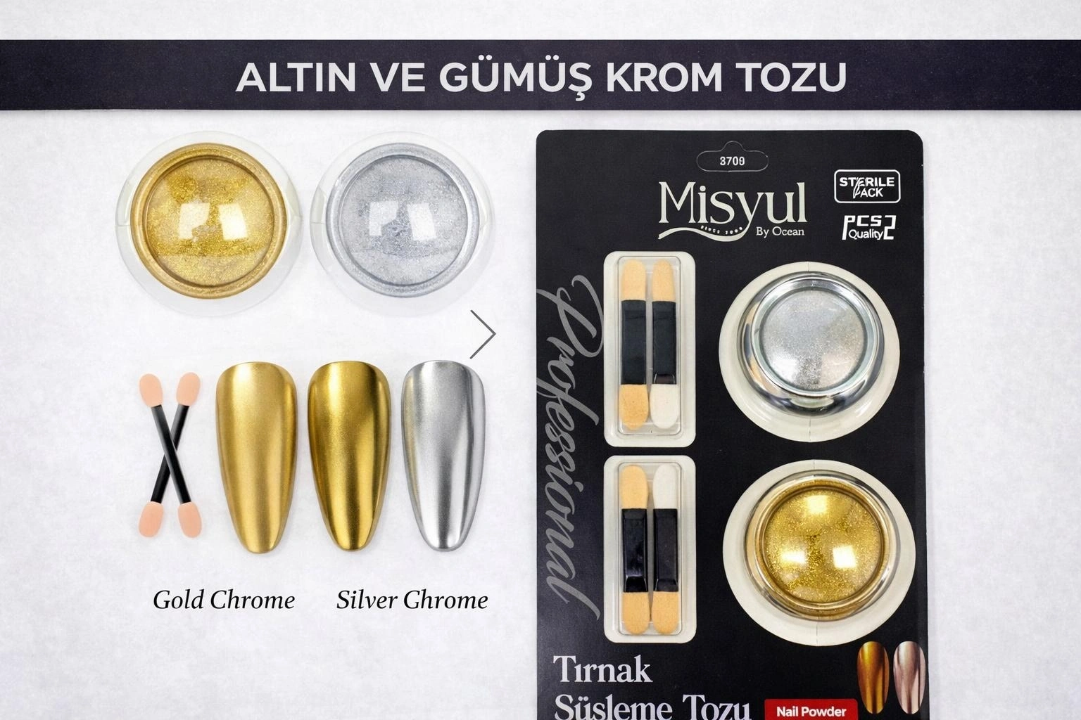 Altın ve gümüş krom tırnak süsleme tozu seti, tırnak yüzeyinde yüksek yansıtıcılığa sahip ayna efekti oluşturarak kusursuz ve profesyonel nail art tasarımları sağlar. Yoğun pigmentli yapısı sayesinde uygulandığı yüzeyde homojen dağılım sunar ve metalik parlaklık oluşturur.