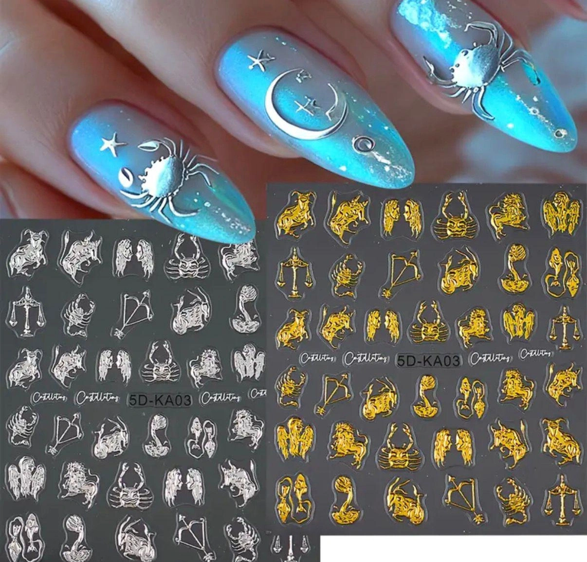 Burçlar temalı 5D tırnak sticker seti; 12 burç figürü ve astrolojik sembolleri gold ve silver seçeneklerle sunar.