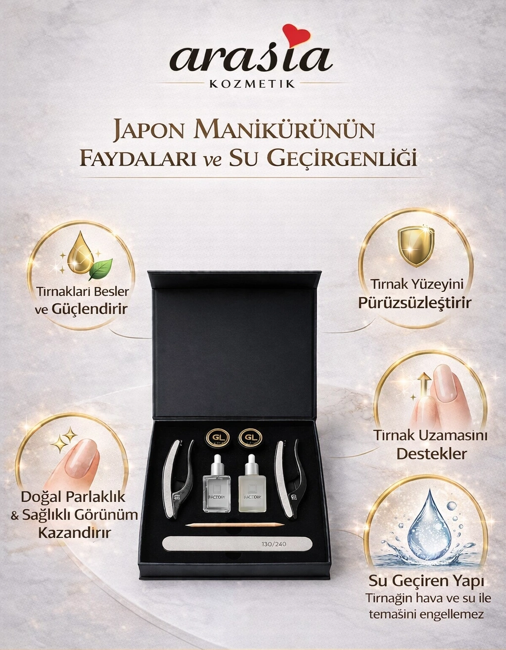 Japon manikürü, tırnakları kapatmak yerine besleyen ve onaran doğal bir bakım yöntemidir. İçeriğindeki özel bileşenler sayesinde tırnak yüzeyine nüfuz ederek zayıf ve kırılgan tırnakların güçlenmesine yardımcı olur.