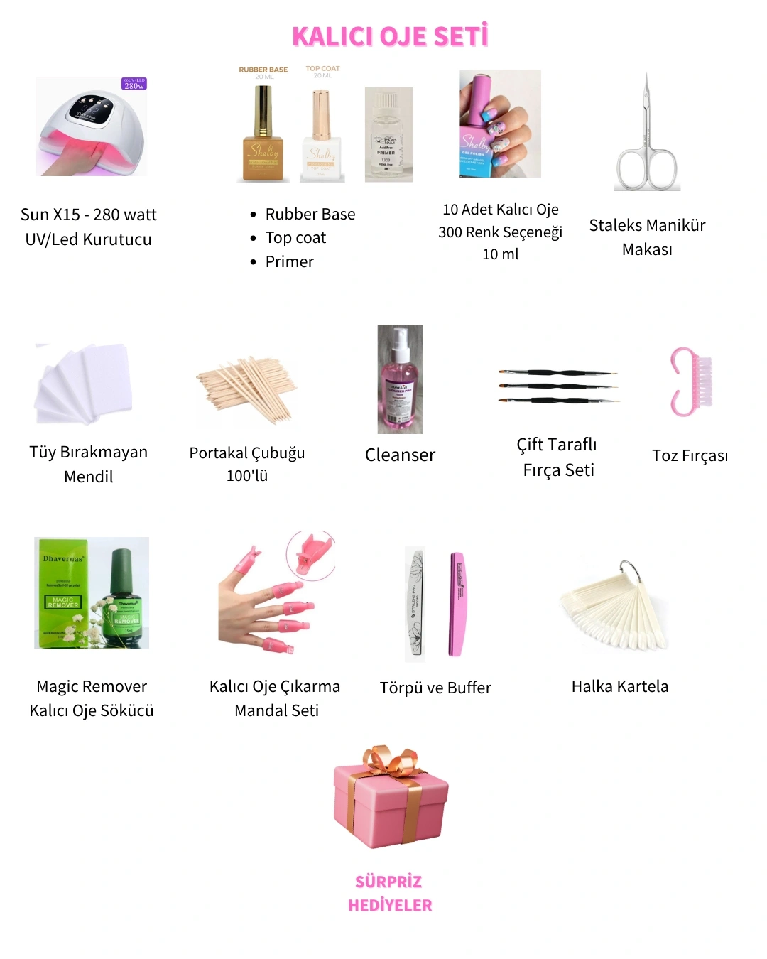 Bu set, hem kişisel kullanım hem de salon uygulamaları için idealdir. Ayrıca sürpriz hediye kutusu ile birlikte gelmektedir.