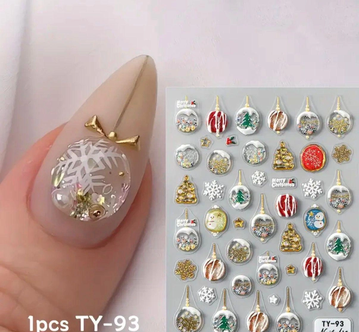 Kar küresi tırnak süsleme sticker seti; yılbaşı konseptli cam küre figürleri, çam ağacı, kar tanesi, noel süsleri ve Merry Christmas yazı detaylarından oluşur.