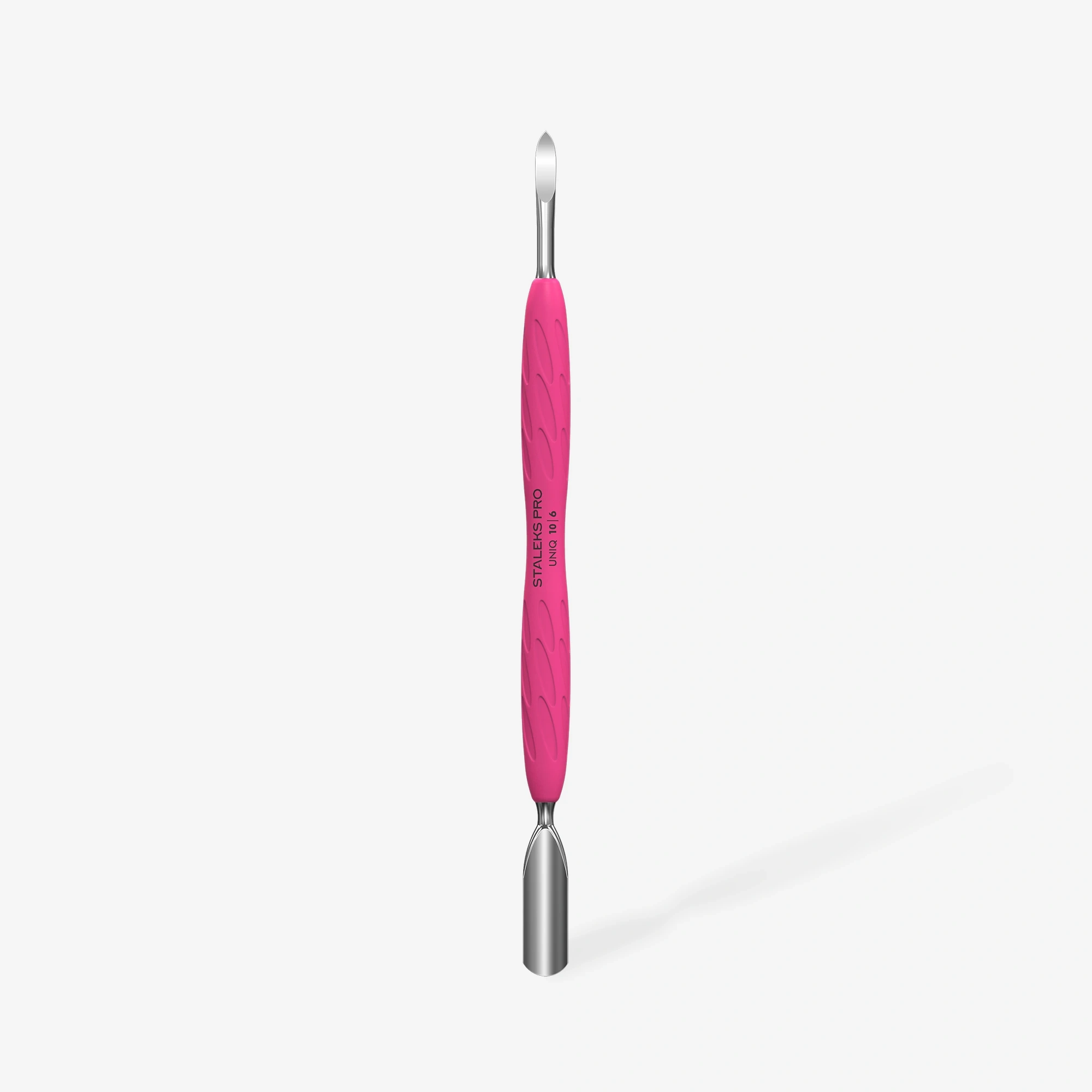 Staleks UNIQ 10 TYPE 6 Gummy silikon saplı tırnak itici, çift taraflı profesyonel kullanım sunar. Geniş yuvarlak uç, tırnak etini kontrollü şekilde geri itmeye yardımcı olurken; kanca uç rascador formu, tırnak yüzeyinde biriken kalıntıların temizlenmesini destekler.